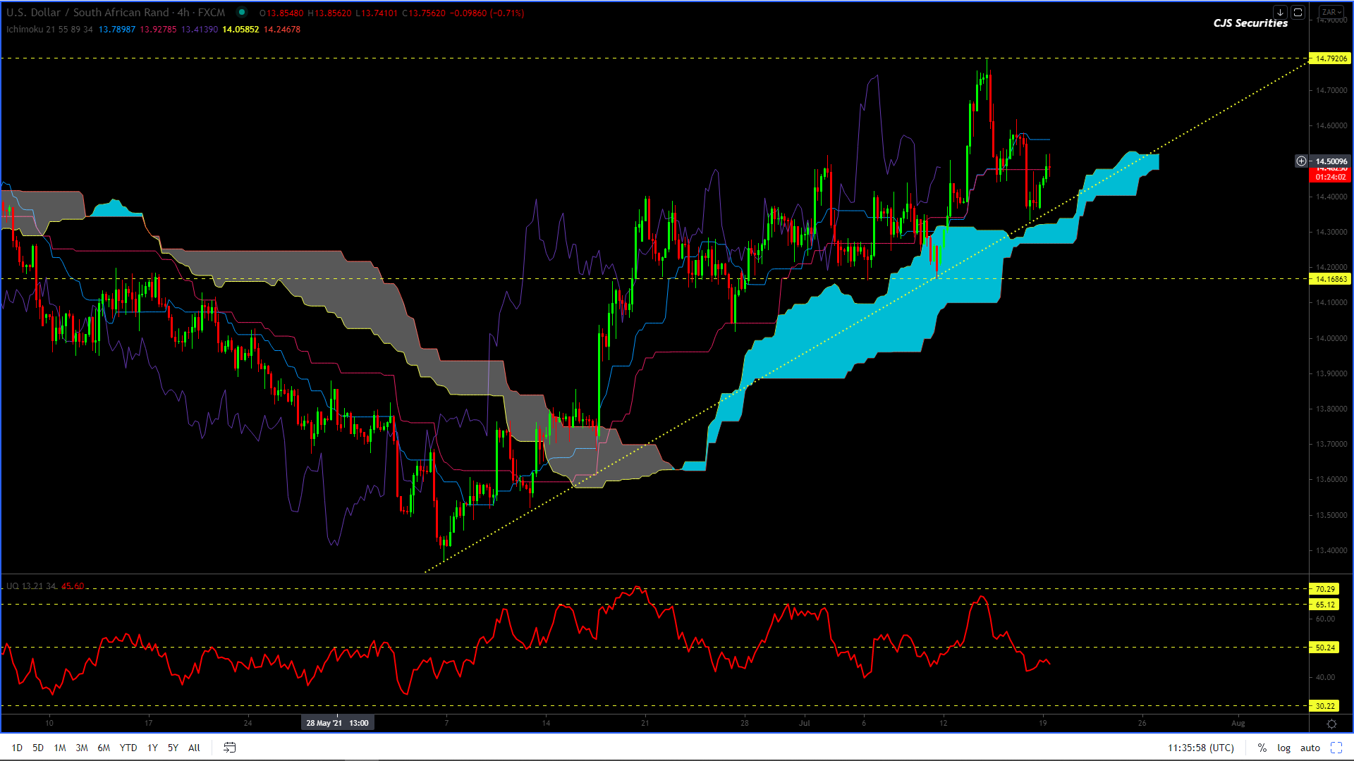 The 240 min is less sexy than the Weekly and Daily charts but has very decent support from R14.36 – R14.17.
