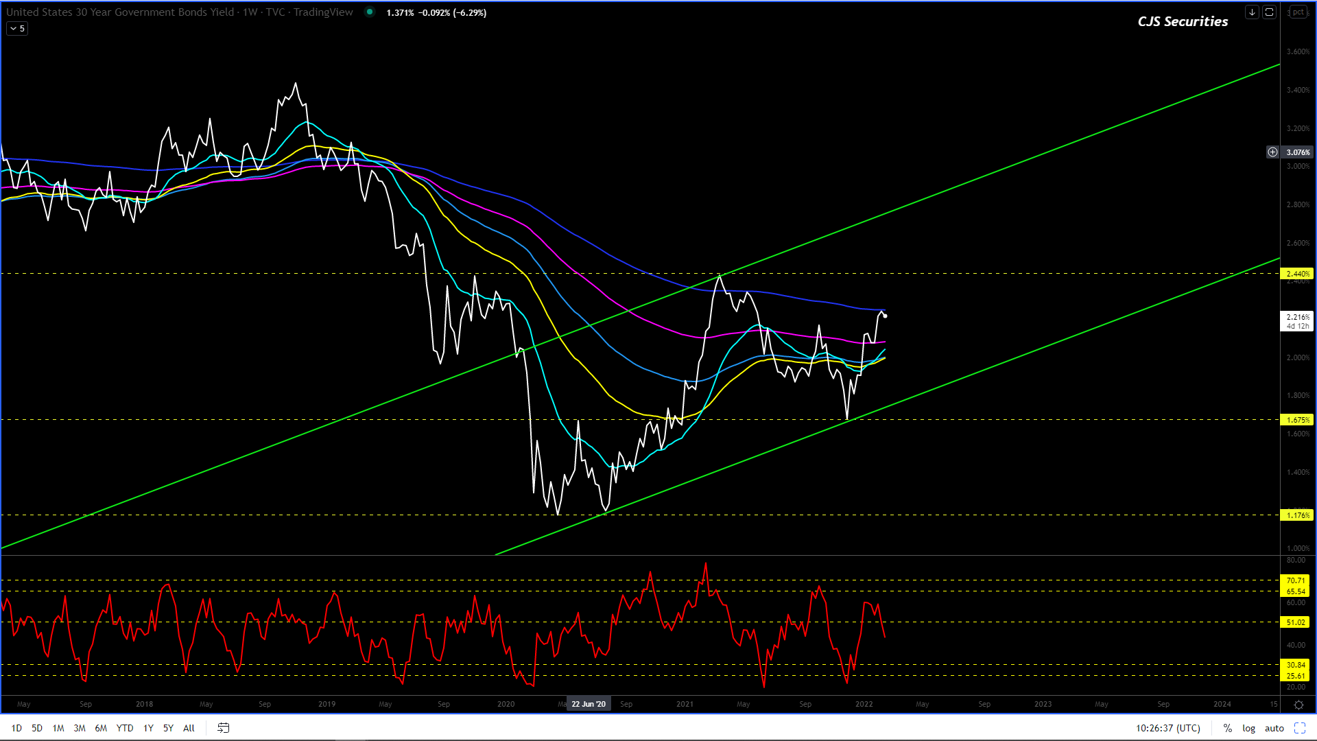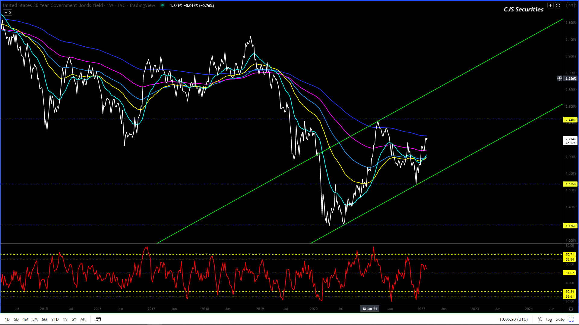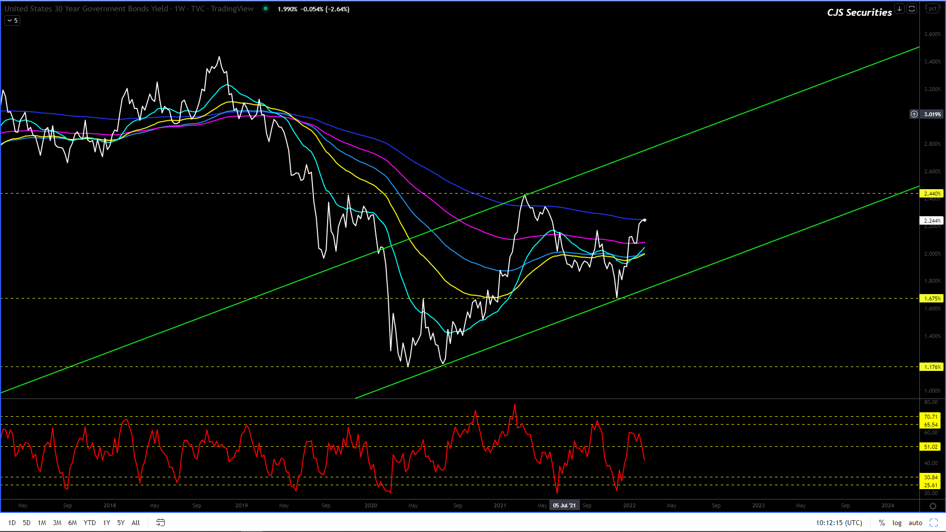 The chart remains range-bound but we feel the move higher toward the top of the range at 11.40% is on the cards before looking to start a severe leg lower to sub 9.00%.