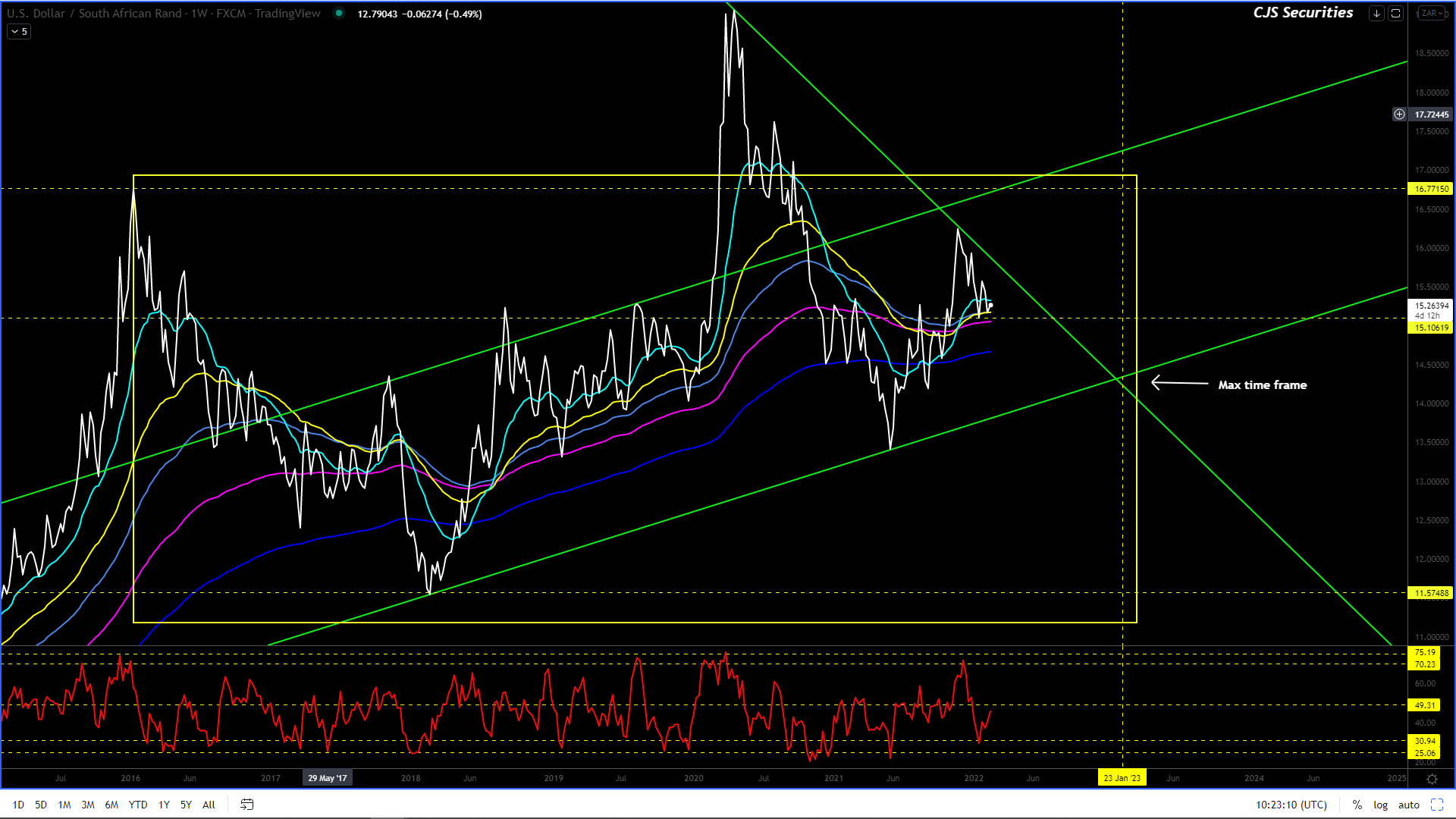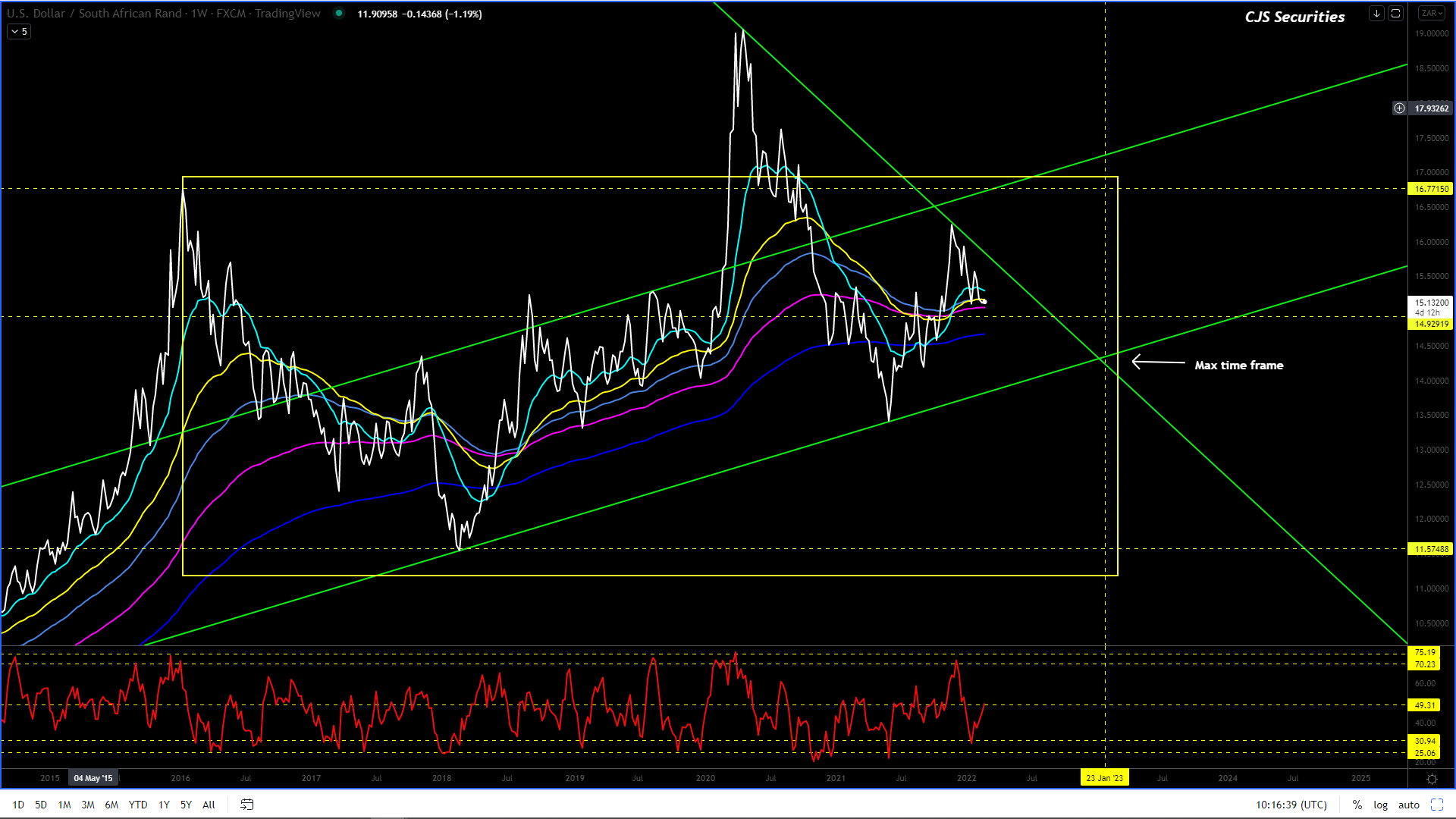 This could easily be attributed to Russia invading the Ukraine or China invading Taiwan or both, which should provide a risk – off environment, causing a quick and painful weakening of the ZAR.
